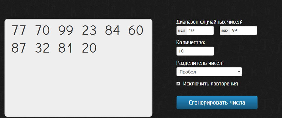 Каждую неделю или раз в две недели (зависит от активности пользователей) я буду генерировать 9 двузначных чисел и выкладывать на сайте скриншот с этими числами.